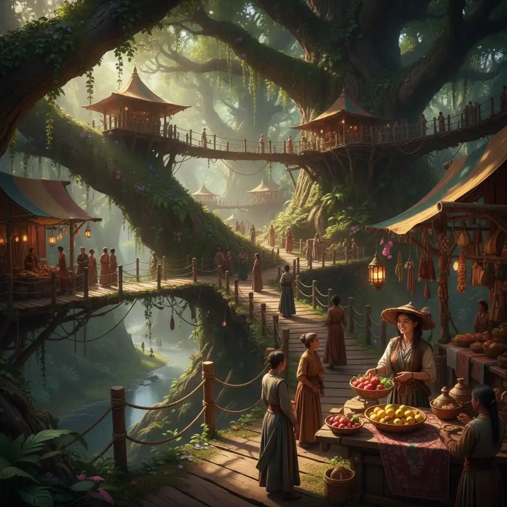 TreeTop is a multi-deck trading post built across interlocked branches of ancient canopy trees in the High Canopy. It serves as a waystation for climbers, gliders, and resin-haulers under the oversight of the Verdant Guild. Rope bridges, counterweighted lifts, and wind-sheltered decks make it a safe stop above Sky Lurker hunting zones.
