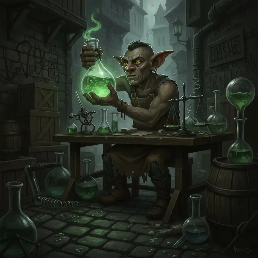 GREEB is a goblin alchemist and street brewer based in Steamroot Market. He specializes in powdered green infusions and support tonics for caravans and patrols. He is loosely tied to the Tea Sages and supplies scouts along the Verdant Steppe.