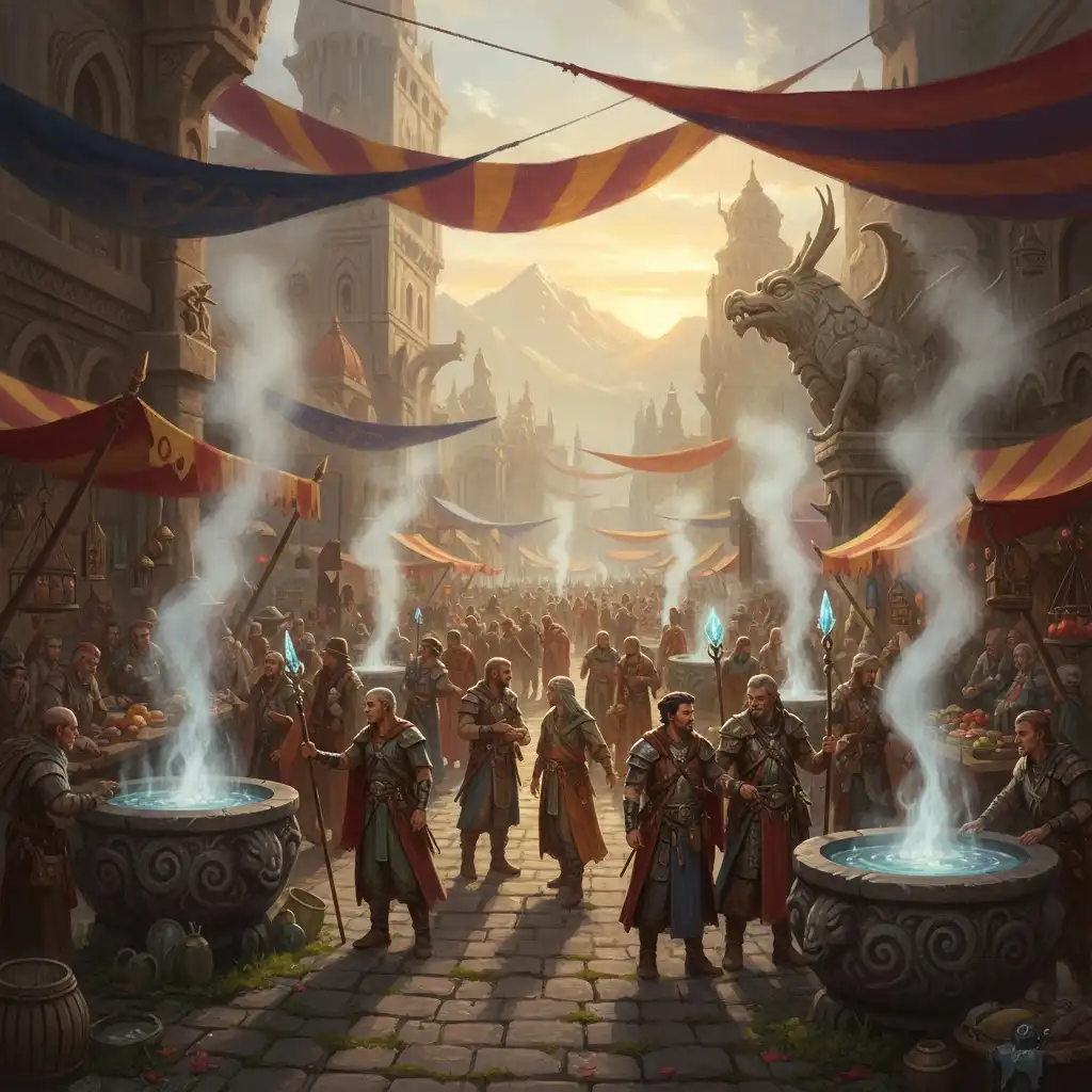 bustling outdoor market with steam vents and stone basins, stalls under cloth canopies, medium-wide shot, soft morning light, warm palette, lively crowd, fantasy setting, painterly detail
