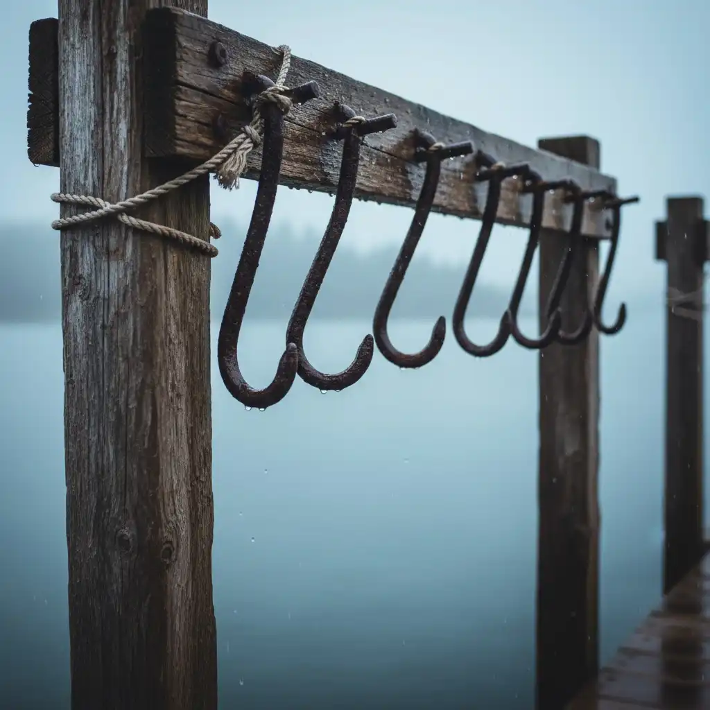 iron gaff hook with ash wood handle on wet pier boards, coiled hemp rope beside, macro product shot, shallow depth of field, cool lantern mist, realistic painterly