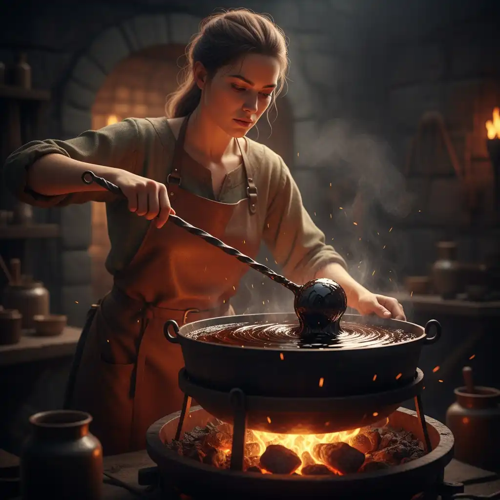 Female chandler reducing kelp into glossy pitch for lamp blends