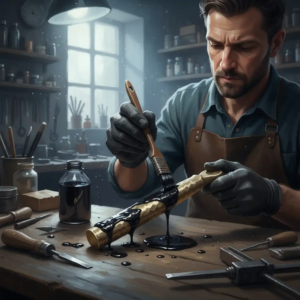 Male bladewright brushing warm pitch into a dagger grip channel