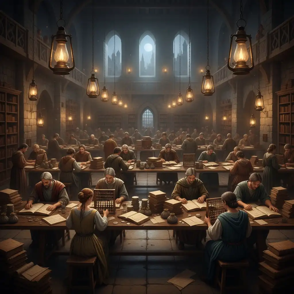 Clerks tallying tariffs on the counting floor at dusk