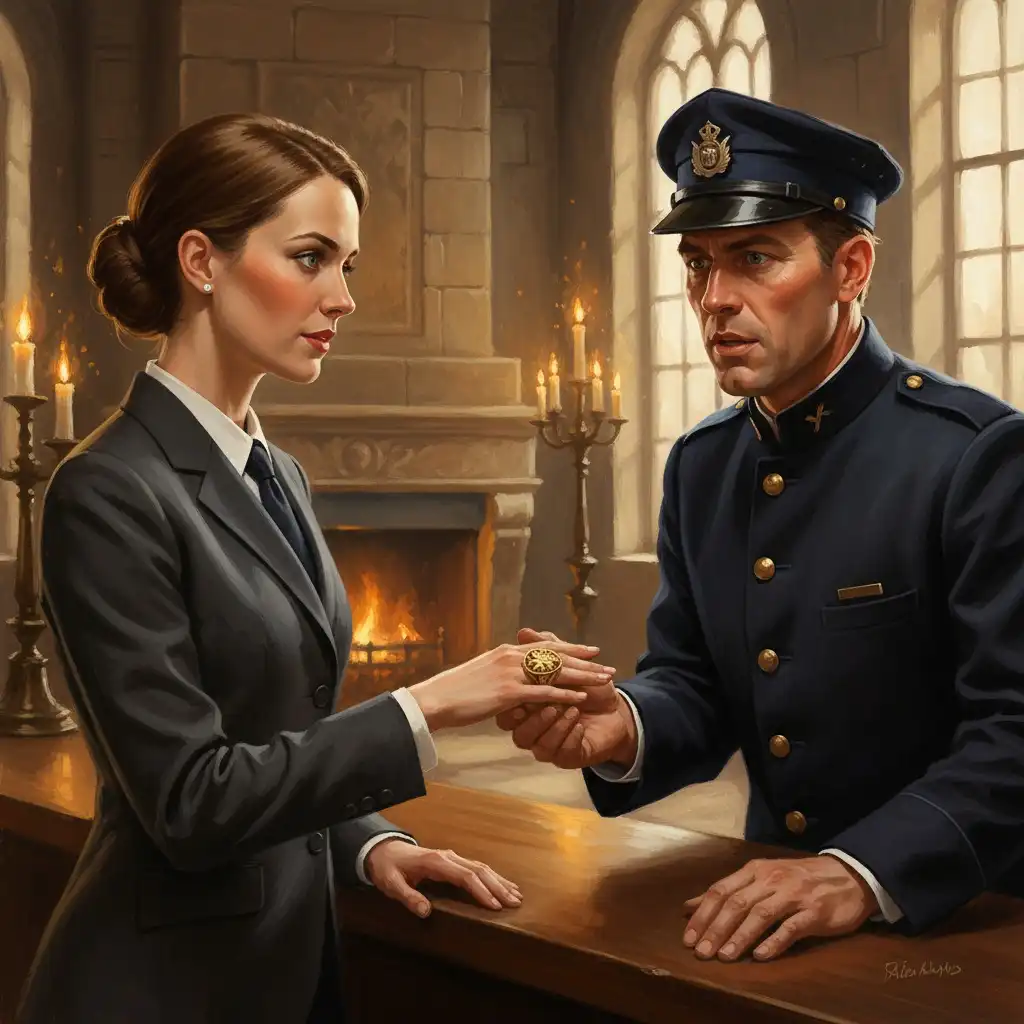 Scillia presenting a signet at the claims desk while a warden observes