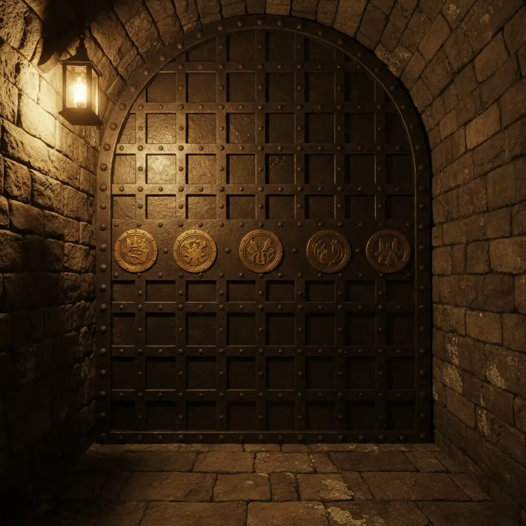- Archive Vault: Ironbound stacks of bonded records; access rotates via cipher slots keyed to a Cipher Deck.