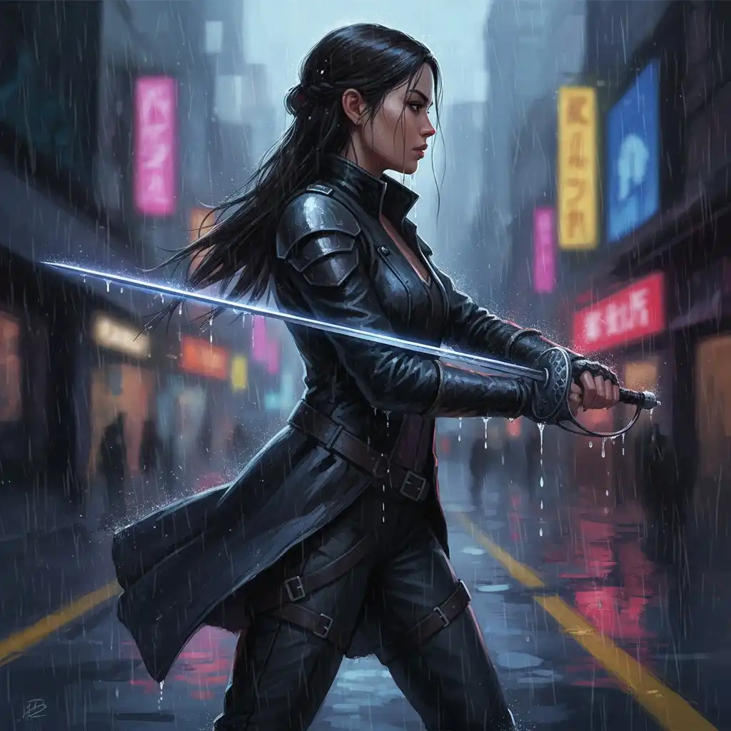 A slim, single-bevel sword with a reinforced spine and monomolecular cutting face. The tang nests in a carbon grip with microtexture for wet-weather control. A low-profile scabbard mounts horizontally for quick draws. The blade hums faintly when aligned, a cue used by Ayesha Aamir to time ripostes in street duels around the Chrome Arc.