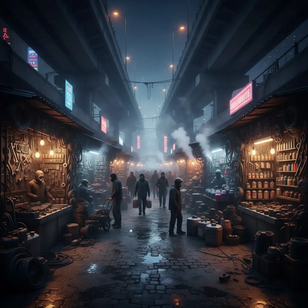 - The Switchyard: covered market stacked with repair booths, solvent stalls, and snack alleys; kiosk run by Mara Kest.