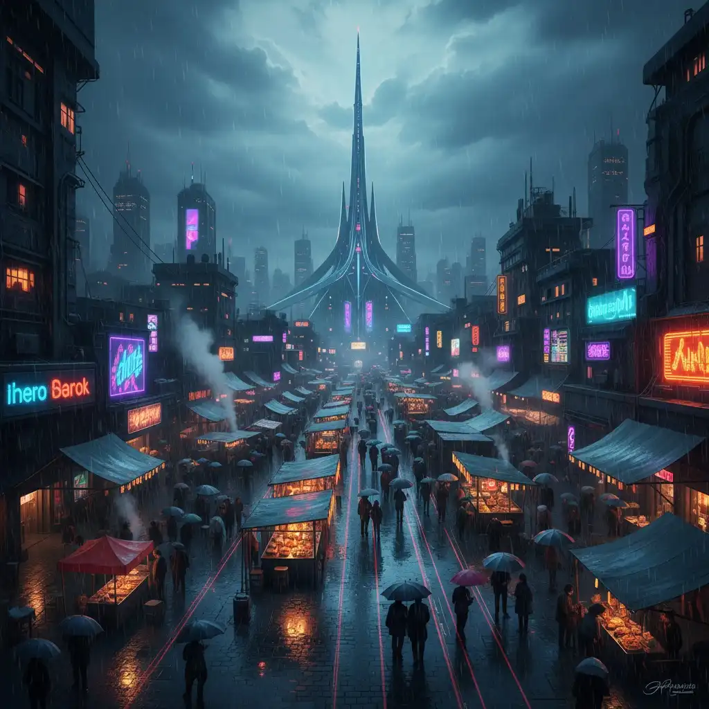 Chrome Arc is a coastal transit-and-market district on the bay rim of Vanta Bay. It functions as a nexus between elevated lanes of the Neon Causeway, a central transit spire, and stacked night markets. Duel culture is prominent, with settlement bouts drawing crowds and fixers like Ayesha Aamir keeping disputes contained to marked courts.